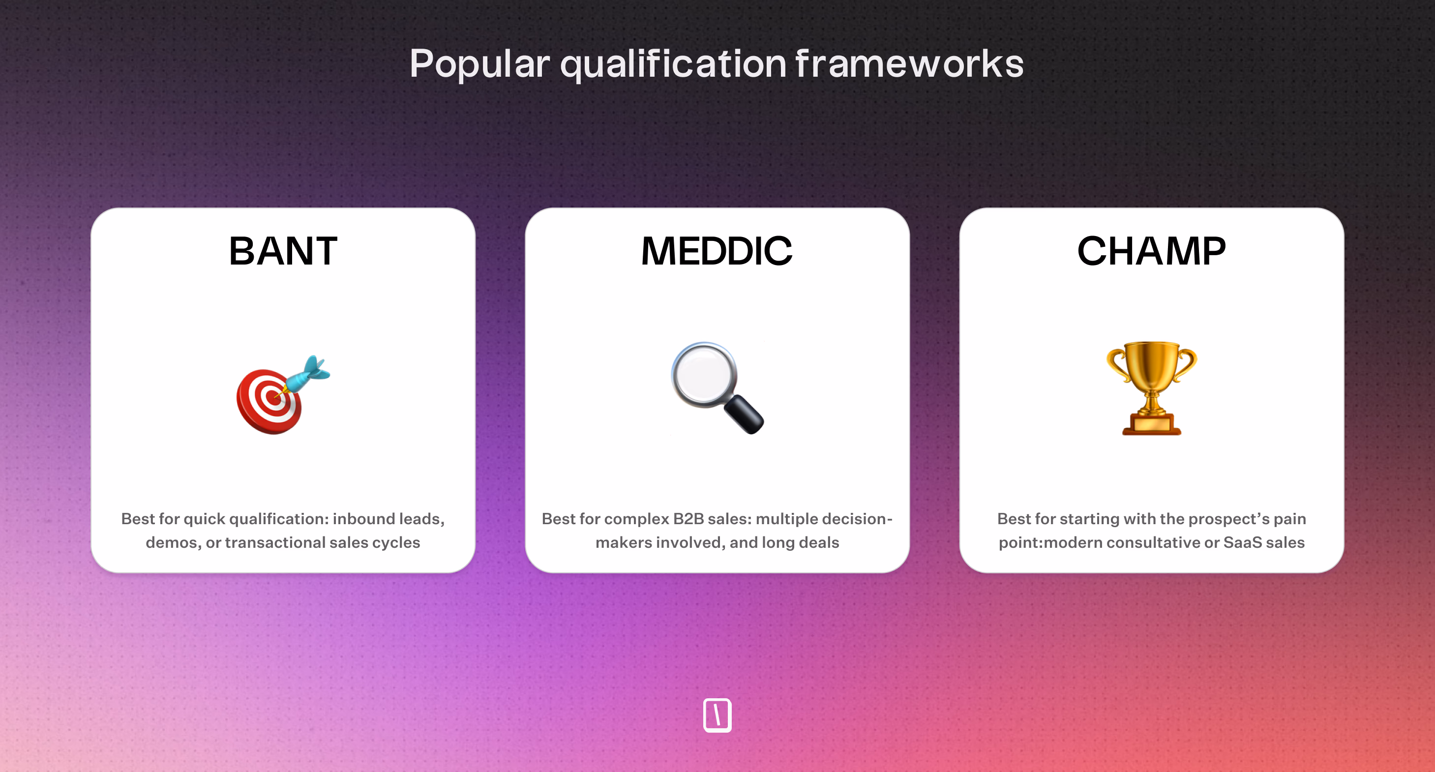 | BANT | Budget, Authority, Need, Timing | Fast lead filtering |