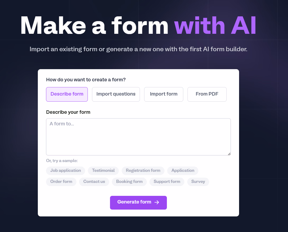 An AI form builder utilizes artificial intelligence to automatically create forms based on your description. Instead of manually adding fields one by one, you tell the AI what you need, and it generates the complete form structure.
