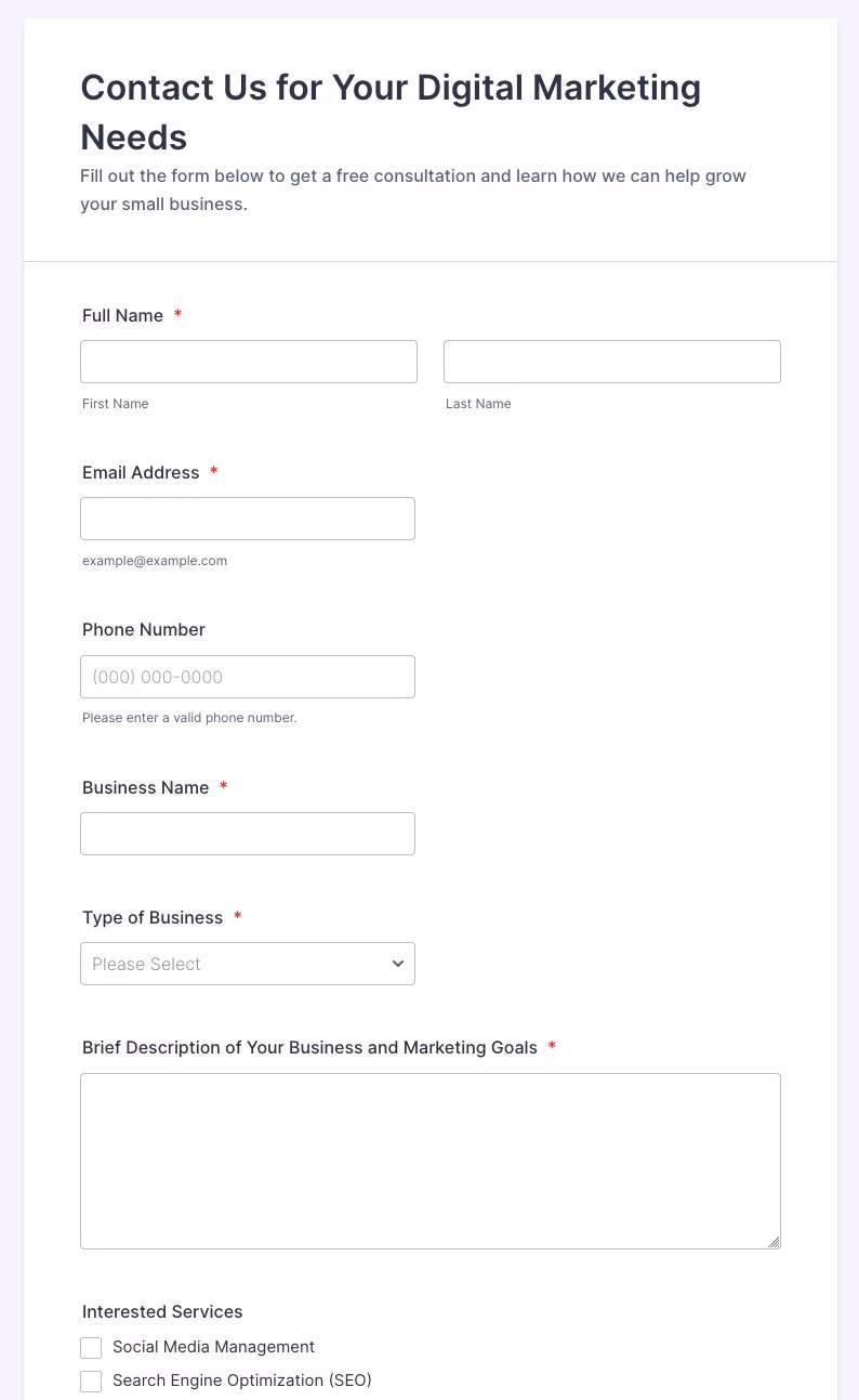 We evaluated each AI form builder using consistent criteria. We attempted to create the same lead generation form across all platforms—specifically, a form for a digital marketing agency targeting small businesses. We measured how well each platform's AI features helped us build this form and generate relevant content.