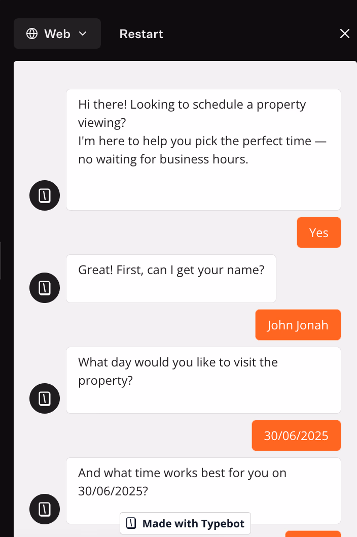 Typebot can schedule a property viewing with name, date, time, and phone number. After that, it confirms the appointment and sends the data to a sheet or CRM.