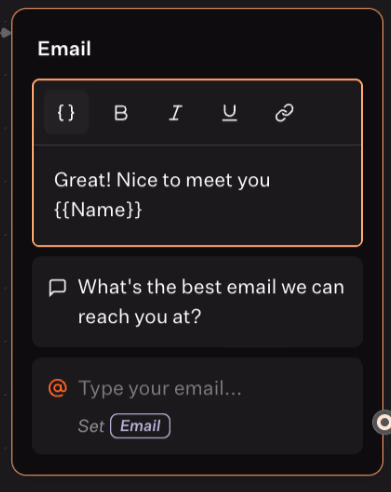 - Add a Text message above the email question: “Great! Nice to meet you {{Name}}” (use variable insertion).