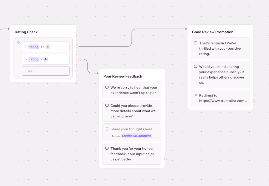 - Create a concise flow with buttons like “Leave a review” and “Tell us what could be better.”