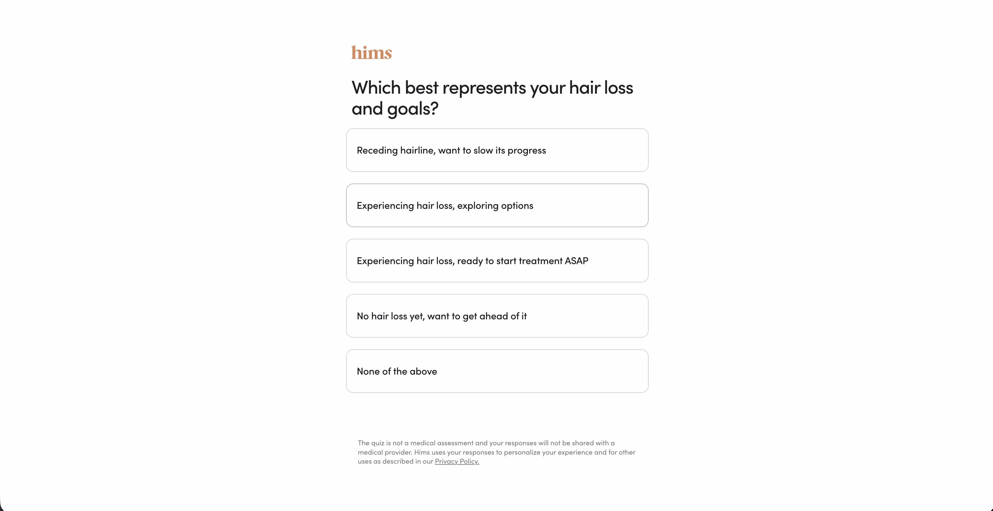 Hims offers a "personalized treatment plan in minutes" by simulating a one-on-one session with a doctor. The quiz acts as a digital triage, closing the gap between free generic advice and costly professional help.
