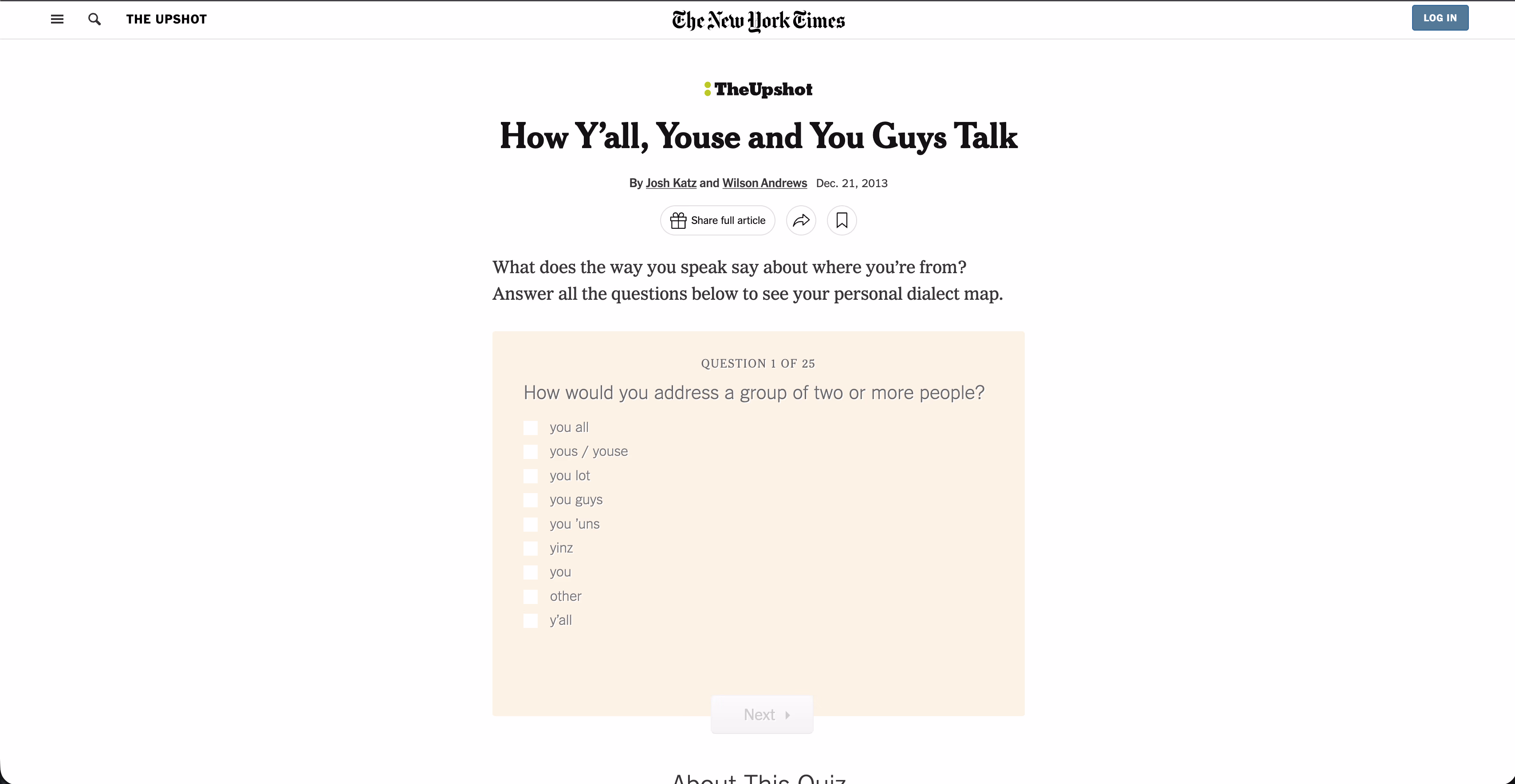 One reason a quiz was among the New York Times website’s most-read stories is simple. People love to talk about themselves. You can find out which Harry Potter house you belong to, choose a dog breed, or discover your dialect. Quizzes attract attention.